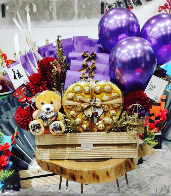 A delightful three-story arrangement featuring a variety of premium chocolates including KitKat, 5 Star, and Cadbury Dairy Milk. Decorated with vibrant red ribbons and blue tissue toppers, this chocolate “cake” is the ultimate gift for any sweet lover in Multan.